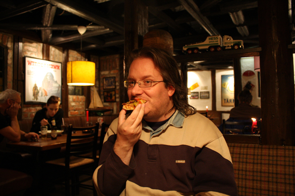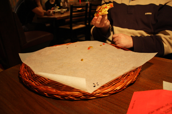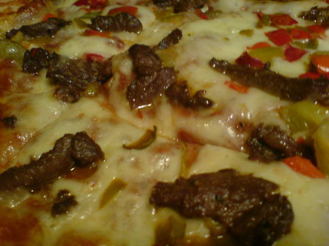 Jeg spiste en hel pizza alene, av typen Pepper steak. Det er så altfor lenge siden sist. Men godt var det og grundig stappmett var man. Såpass at det å bøye seg var smertefult.